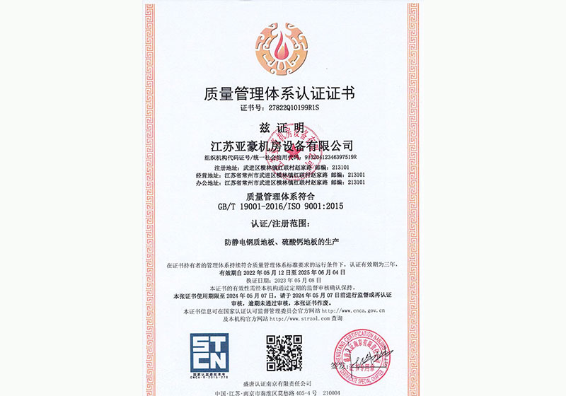 江蘇亞豪機(jī)房設(shè)備有限公司創(chuàng)建于2015年,坐落在蘇錫常中心地帶,是一家專業(yè)活動地板制造商,集設(shè)計、制造、銷售、安裝一體并通過ISO9001質(zhì)量管理體系認(rèn)證。